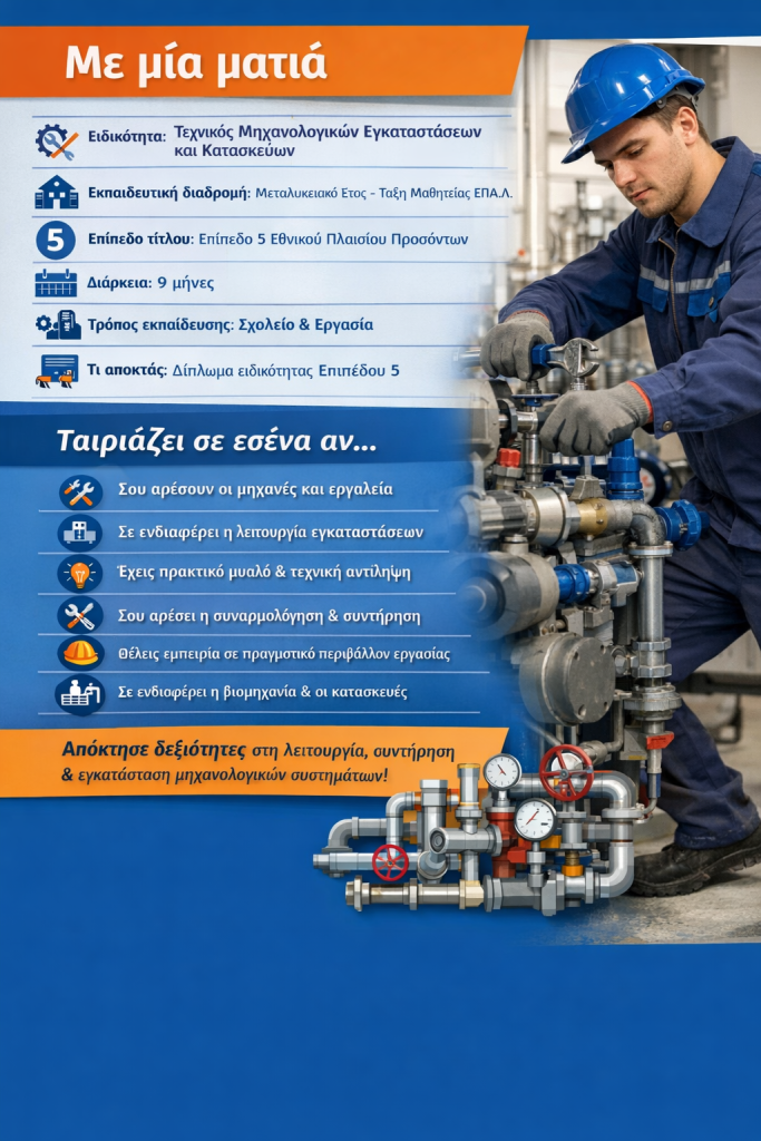 Τεχνικός Μηχανολογικών Εγκαταστάσεων και Κατασκευών – Μεταλυκειακό Έτος Μαθητείας ΕΠΑ.Λ.