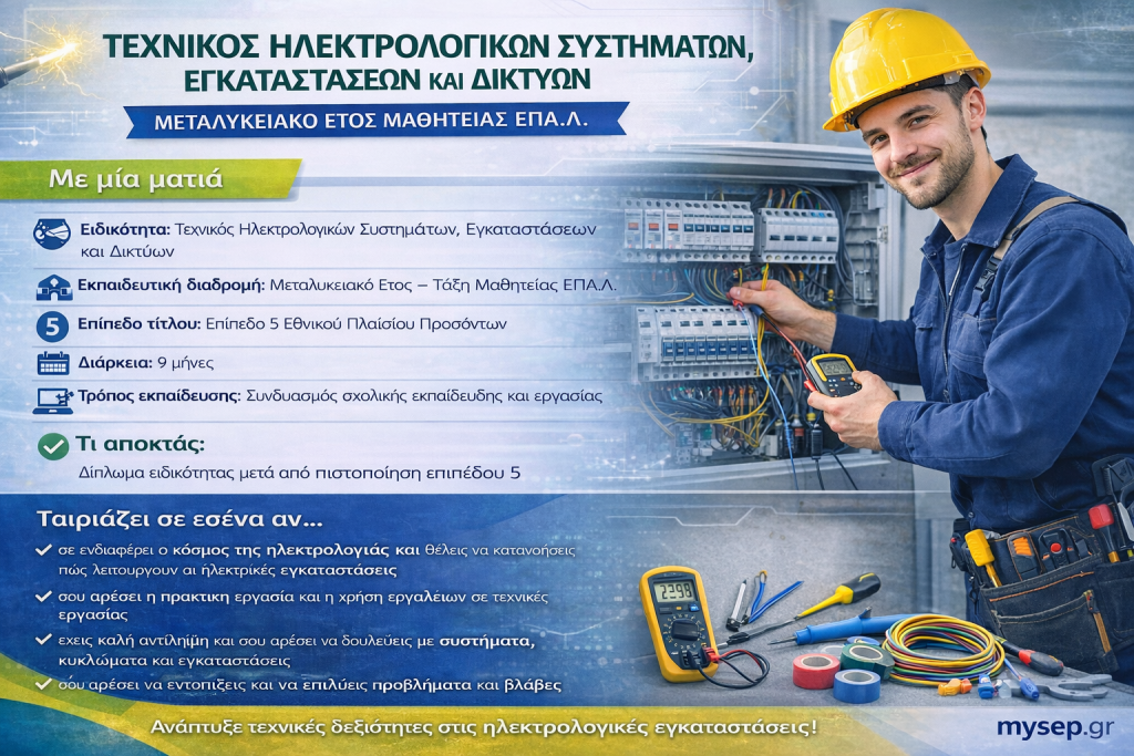 Τεχνικός Ηλεκτρολογικών Συστημάτων, Εγκαταστάσεων και Δικτύων – Μεταλυκειακό Έτος Μαθητείας ΕΠΑ.Λ.