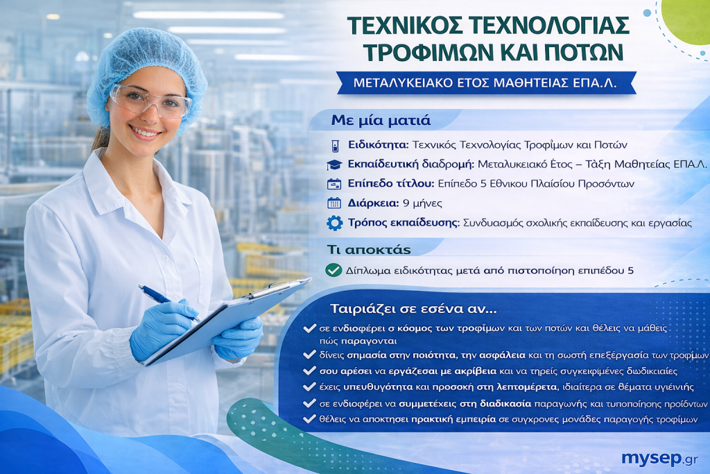 Τεχνικός Τεχνολογίας Τροφίμων και Ποτών – Μεταλυκειακό Έτος Μαθητείας ΕΠΑ.Λ.