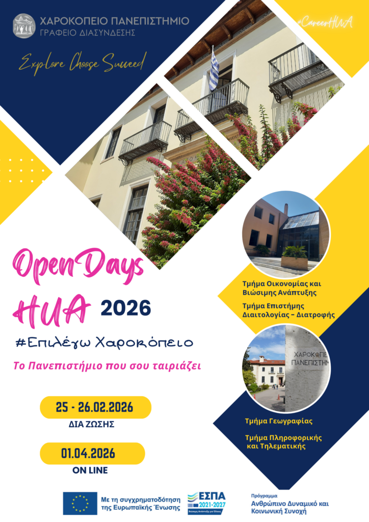 Το Γραφείο Διασύνδεσης Σπουδών και Σταδιοδρομίας του Χαροκοπείου Πανεπιστημίου, στο πλαίσιο της δράσης #ΕπιλέγωΧαροκόπειο, η οποία υλοποιείται με συνέπεια εδώ και 21 χρόνια, ενημερώνει μαθητές και μαθήτριες της Δευτεροβάθμιας Εκπαίδευσης που θα συμμετάσχουν στις Πανελλαδικές Εξετάσεις 2026 για τις σπουδές στο Χαροκόπειο Πανεπιστήμιο.