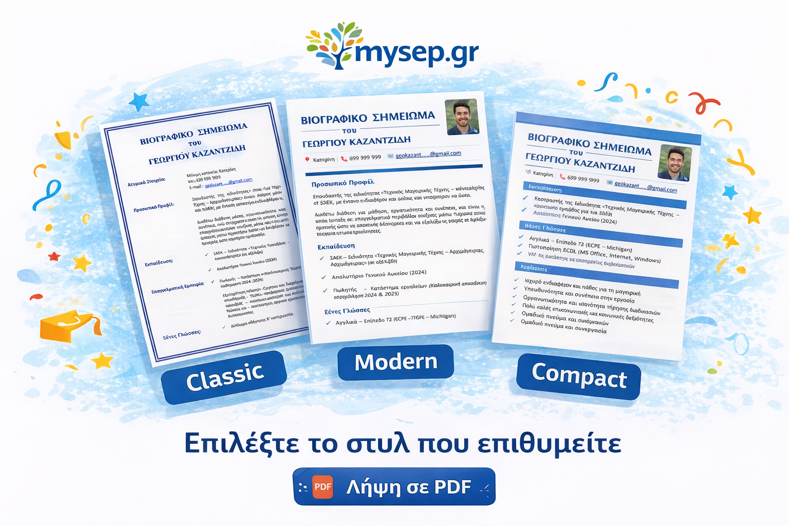 επιλέγεις template (Classic, Modern, Compact)
