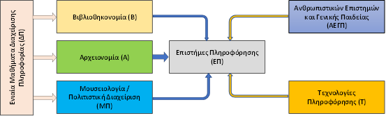 Παράλληλα, οι ομάδες μαθημάτων Αρχειονομίας, Βιβλιοθηκονομίας και Μουσειολογίας / Πολιτιστικής Διαχείρισης εξετάζουν τους αντίστοιχους πληροφοριακούς οργανισμούς, το υλικό και τους τρόπους διαχείρισής του μέσα στο γενικότερο κοινωνικό, εκπαιδευτικό, οικονομικό και πολιτιστικό περιβάλλον.